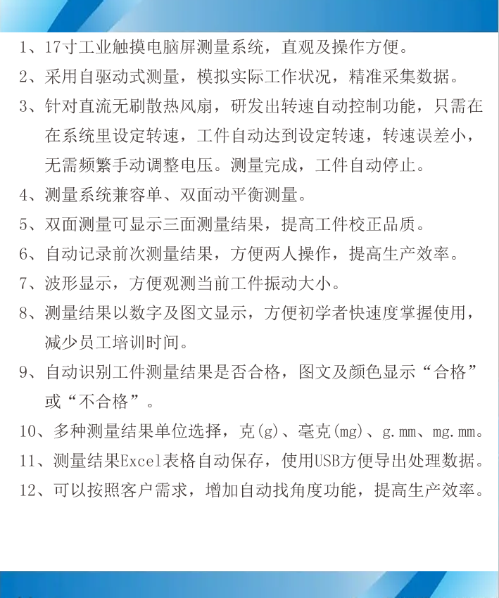 主要应用:单面平衡机主要适用于散热风扇、离心及轴流风扇叶、吸尘器、风叶、涡轮风叶等各种盘状或高速要求工件的平衡测量校正。操作简便,重复性好,工作效率高。