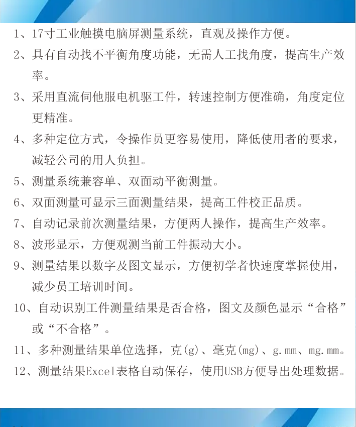 主要应用:双面平衡机主要适用于各种类型的电机转子、航模电机、空心杯电机、滚筒、胶棍、风机、电动工具、木工机械、印刷机械、机床主轴等高速旋转工件的平衡测量校正。操作简便,重